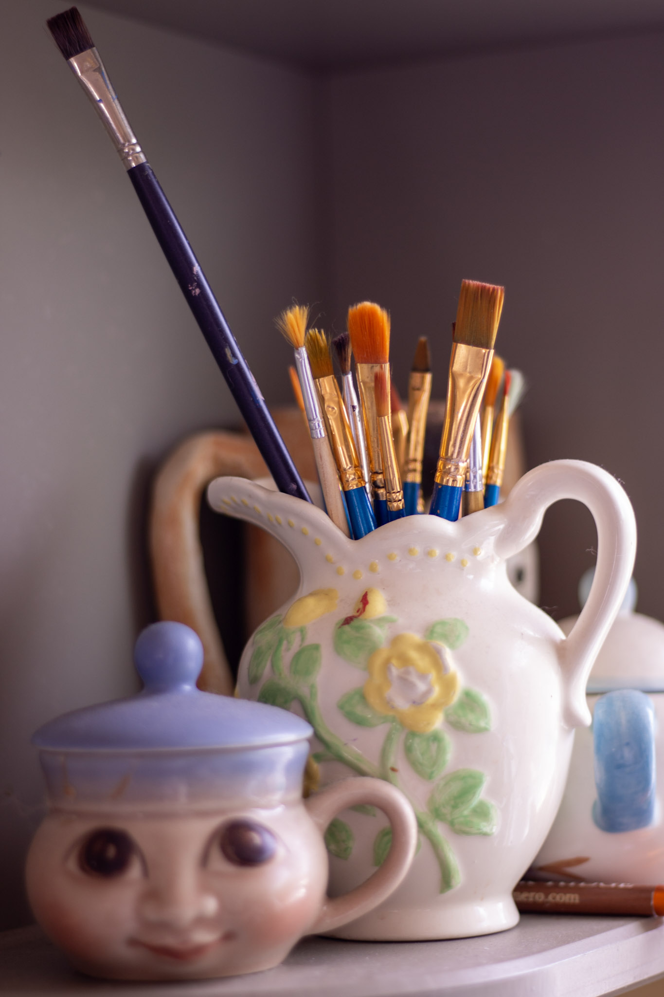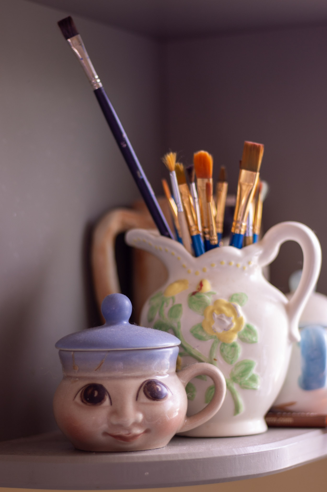 In the first shot the focus is on the front brushes. In the second shot the focus is on the chipped flower on the pitcher. And in the third shot the focus is on the left eye of the front cup. It has been a long time since I’ve been able to dial in my focus this well without a tripod and focusing manually. Which has been pretty impossible lately because my eyesight went wonky and I didn’t realize how bad it was until I got glasses, but that is a story for another day.